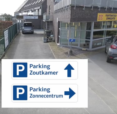De parking van de zoutkamer ligt aan de linker kant van het gebouw. Gelieve niet te parkeren op de parking van het zonnecentrum.